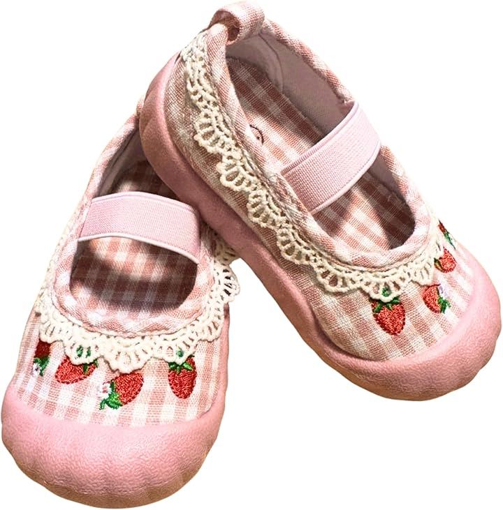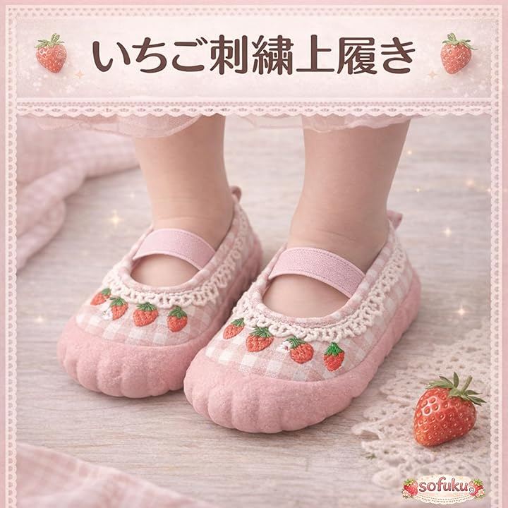 女の子向けの上履きタイプのシューズで、ギンガムチェックといちご刺繍、レースを組み合わせたやさしいデザインです