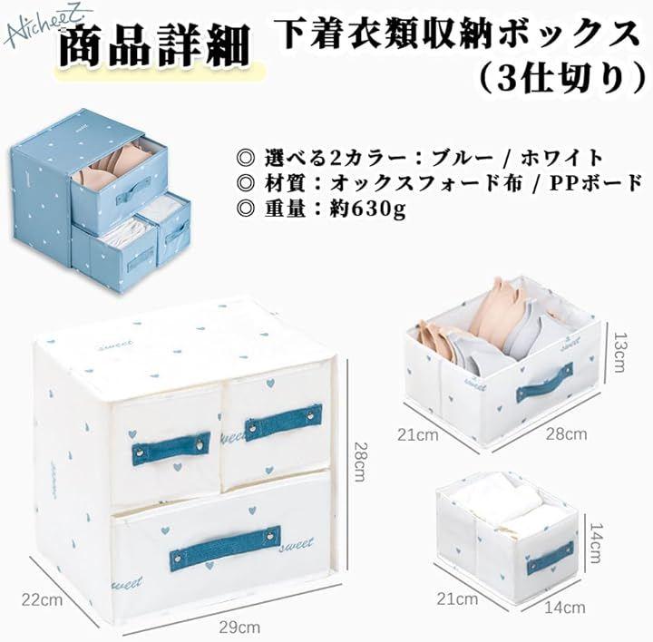 「商品内容」 下着衣類収納ボックス(3仕切り) 材質:オックスフォード布/PPボード カラー:ホワイト/ブルー サイズ:幅/約29cm 奥行き/約22cm 高さ/約28cm 重量:約630g