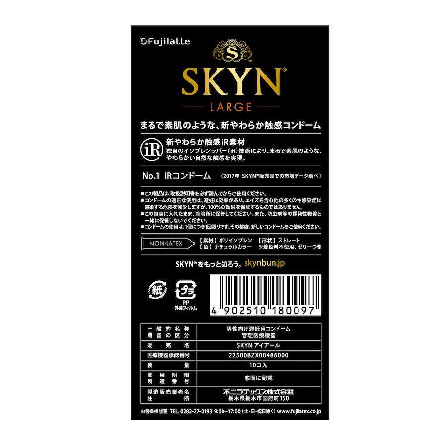 イソプレンラバーを使用した人肌に近い柔らかさが特徴のIRコンドーム。直径38mmが新登場。この柔らかさとLサイズがより多くのカップルの距離を近づけます。のラージサイズまるで素肌のような、新やわらか素材新やわらか素材iR素材独自のイソプレンラバー(iR)技術により、まるで素肌のような、やわらかい自然な触感を実現。形状:ストレート、色:ナチュラルカラー、着色料不使用、ゼリーつきSKYNは世界No,1シェアのiRコンドームです。PREMIUMより大きめゆったりサイズ。 材質:素材:ポリイソプレン 内容量:10個入り 全てがワンランク上のラグジュアリーコンドーム新登場 商品サイズ (幅×奥行×高さ) :63×35×124mm 管理医療機器 医療機器認証(承認)番号:22500BZX00486000 原産国:タイ 肌のやわらかさに近いから自然で何もつけていない感じの新素材IRと洗練されたデザインで「持っていることがきもちいい」