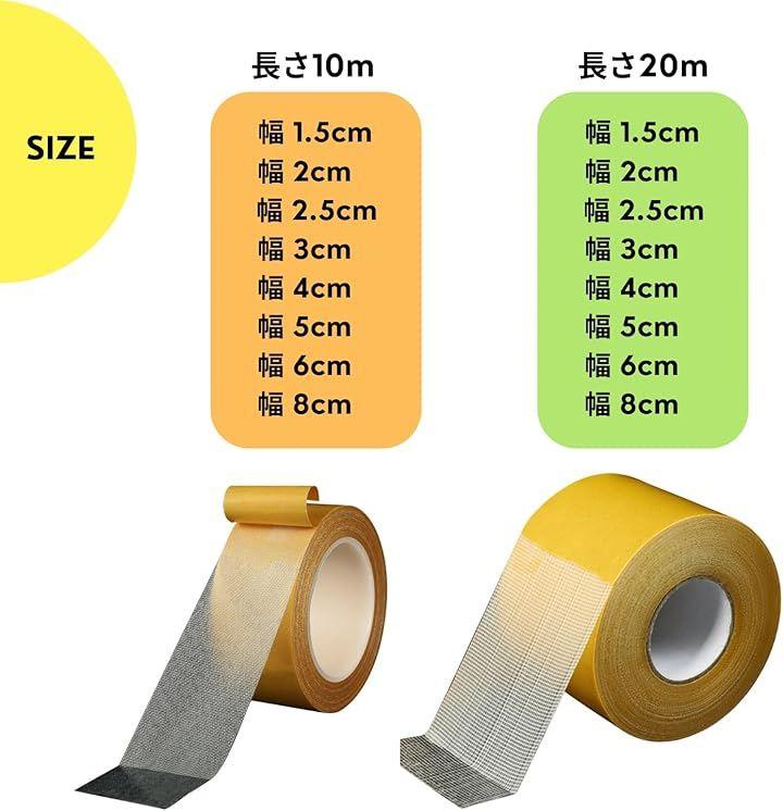 「サイズ」イエロー:幅1.5cm 長さ10m、幅2cm 長さ10m、幅2.5cm 長さ10m、幅3cm 長さ10m、幅4cm 長さ10m、幅5cm 長さ10m、幅6cm 長さ10m、幅8cm 長さ10m、幅1.5cm 長さ20m、幅2cm 長さ20m、幅2.5cm 長さ20m、幅3cm 長さ20m、幅4cm 長さ20m、幅5cm 長さ20m、幅6cm 長さ20m、幅8cm 長さ20m