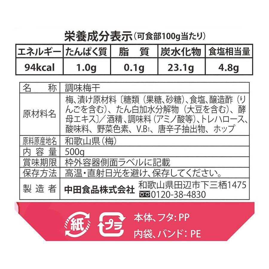 内容量 : 500g原材料 :梅(和歌山県産)・漬け原材料[糖類(果糖・砂糖)、食塩、醸造酢(りんごを含む)、たん白加水分解物(大豆を含む)、酵母エキス]、酒精、調味料(アミノ酸等)、トレハロース、酸味料、野菜色素、V.B1、唐辛子抽出物、ホップ賞味期限 : 約5か月栄養成分表示(可食部100g当たり) : エネルギー(94kcal)、たんぱく質(1.2g)、脂質(0.1g)、炭水化物(22.3g)、ナトリウム(2.1g) ※食塩相当量(5.3g)塩分濃度 : 約5%