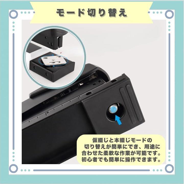 「モード切り替え」仮綴じと本綴じモードの切り替えが簡単にでき、用途に合わせた柔軟な作業が可能です。