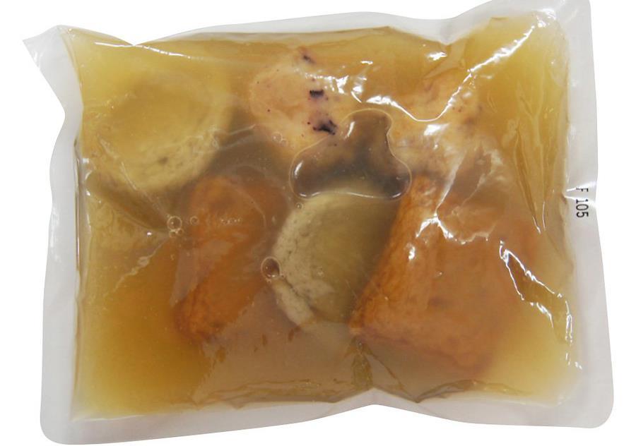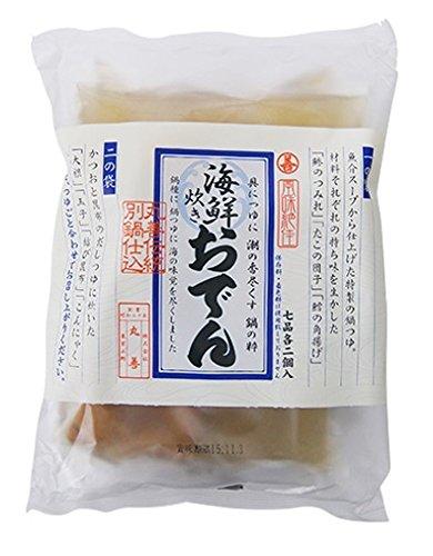 〈練り種〉魚肉練製品(さつま揚、たこ入り揚げかまぼこ、あじ揚げかまぼこ)、おでんつゆ〔食塩、しょうゆ、砂糖、粗砕かつお節、粉砕混合節(さば節、いわし煮干)、こんぶエキス、こんぶ〕、還元水あめ、かきエキス、煮干エキス、ほたてエキス、加工デンプン、調味料(アミノ酸等)、(原材料の一部に小麦、卵、ごまを含む)〈野菜種〉大根、ゆで卵、こんにゃく、おでんつゆ〔食塩、しょうゆ、砂糖、粗砕かつお節、粉砕混合節(さば節、いわし煮干)、こんぶエキス、こんぶ〕、こんぶ、醤油加工品、調味料(アミノ酸等)、水酸化Ca、(原材料の一部に小麦を含む)