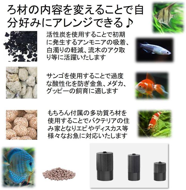 もちろん付属の多功質ろ材を使用することでバクテリアの住み家となりエビやディスカス等様々なお魚に対応いたします。