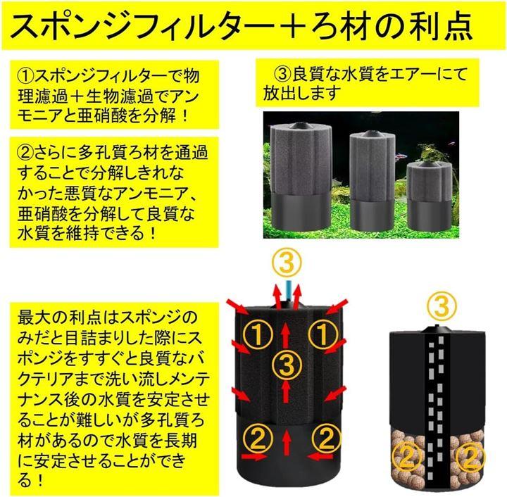「スポンジフィルター+ろ材の利点 (3)」最大の利点はスポンジのみだと目詰まりした際にスポンジをすすぐと良質なバクテリアまで洗い流しメンテナンス後の水質を安定させることが難しいが多孔質ろ材があるので水質を長期に安定させることができる。
