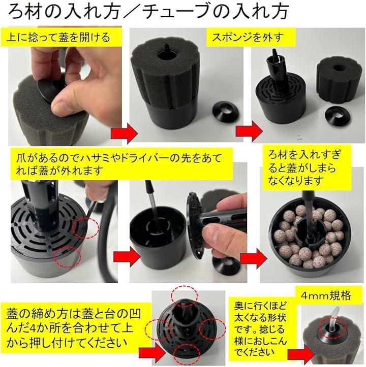 「スポンジフィルター+ろ材の利点 (1)」スポンジフィルターで物理濾過+生物濾過でアンモニアと亜硝酸を分解。