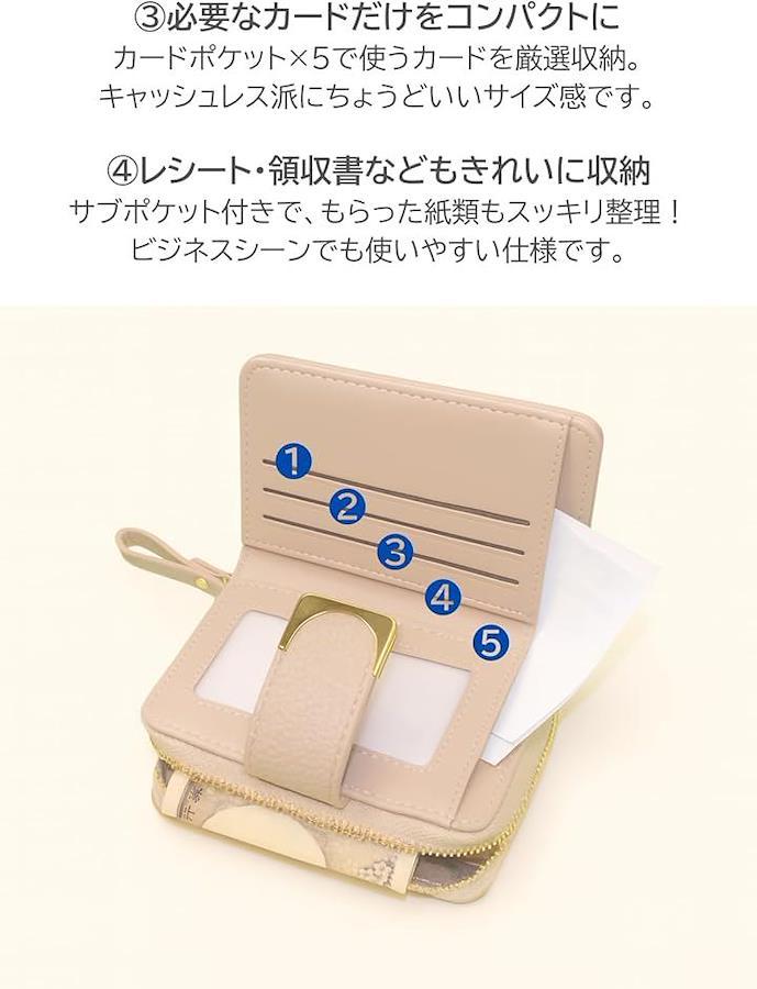 カードポケット5枚、小銭ポケット(仕切りあり)、レシート・お札用のサブポケット付き《*お札は折りたたんで収納する仕様》