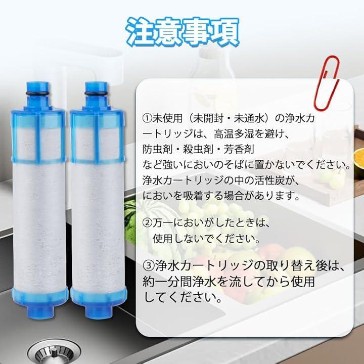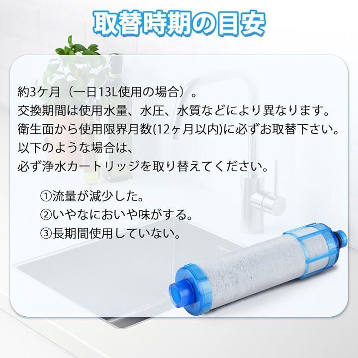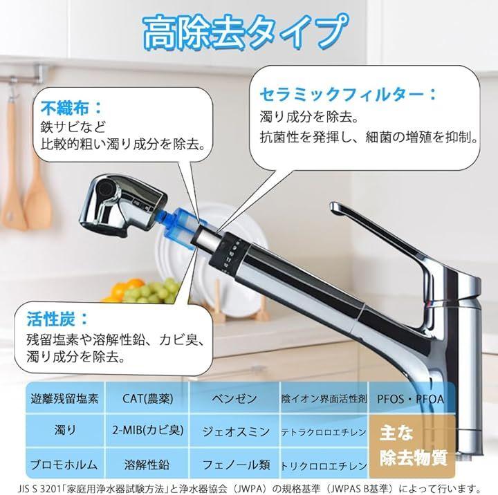 「12+1物質高除去」遊離残留塩素(カルキ)、PFOS/PFOA、濁り、溶解性鉛、2-MIB(カビ臭)、CAT(農薬)、ブロモホルム、テトラクロロエチレン、トリクロロエチレン、ベンゼン、ジェオスミン、陰イオン界面活性剤、フェノール類などの物質を除去、水道水を綺麗で美味しい水に変えます。