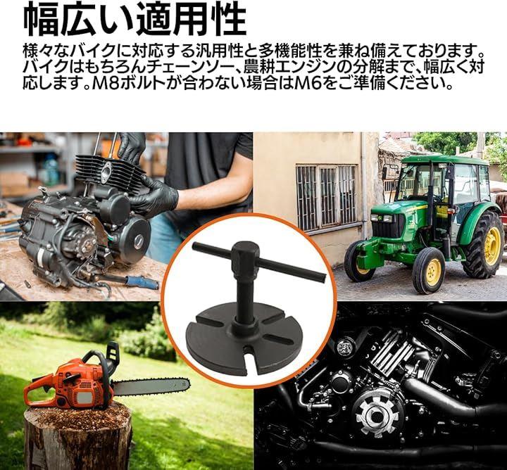 「幅広い適用性」フライホイールプーラーは、エンジンチューニングやオーバーホールに対応する汎用性と多機能性を備えており、バイクの他、チェーンソーや農耕エンジンの分解にも幅広く対応、クランクセパレーターやハーモニックバランサー、ベアリングプーラーとしても使用でき、M8ボルトが合わない場合は別途M6ボルトをご準備ください