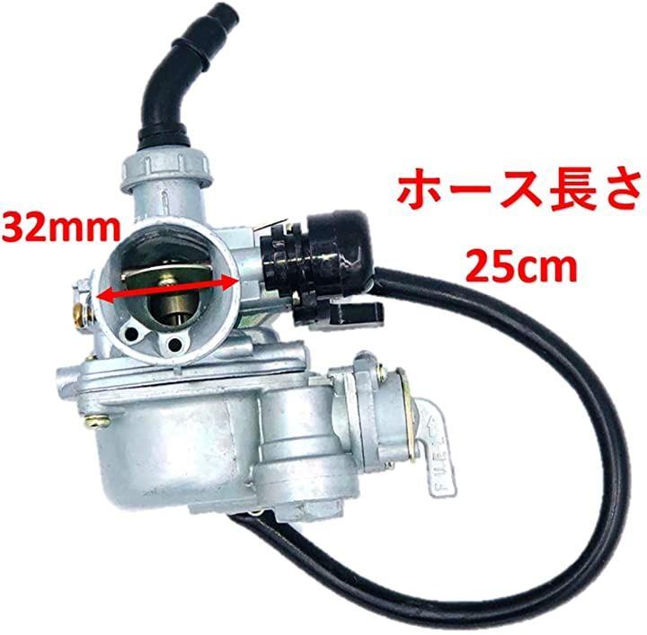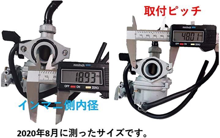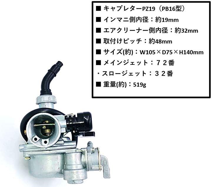 ・* インマニ側内径:約19mm * エアクリーナー側内径:約32mm * 取付けピッチ:約48mm * サイズ(約):W105xD75xH140mm * メインジェット:72番 スロージェット:32番 * 重量(約):519g