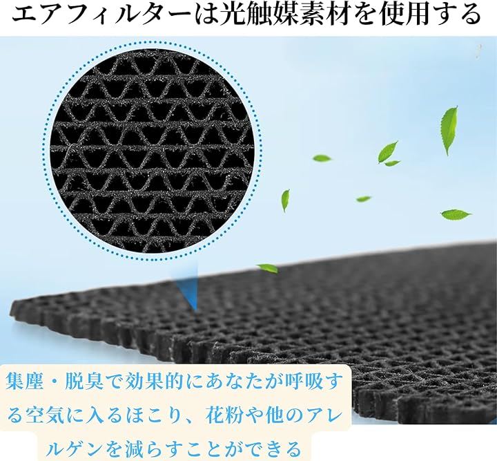 「機能」エアフィルターは光触媒素材を使用し、集塵・脱臭で効果的にあなたが呼吸する空気に入るほこり、花粉や他のアレルゲンを減らすことができます。