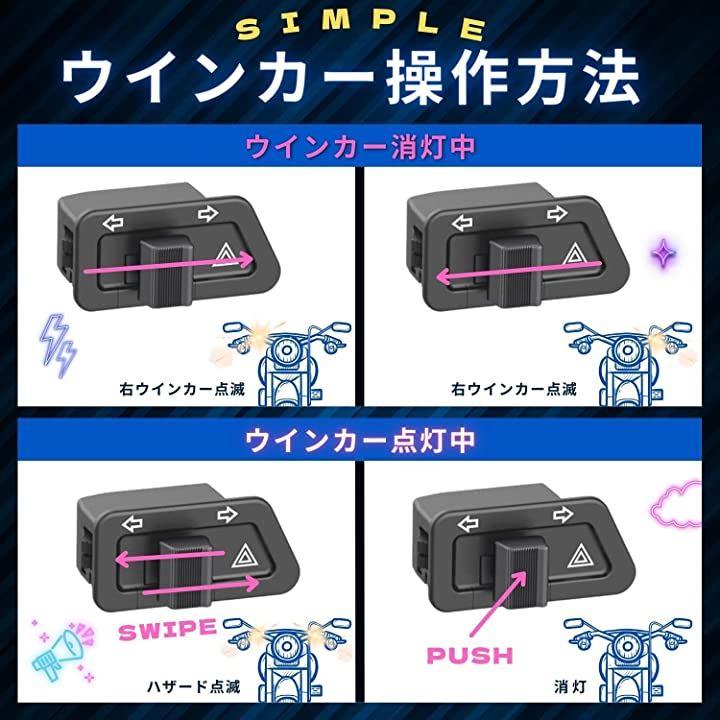 ・「操作方法」 スイッチの左が左ウィンカー、右が右ウィンカー、スイッチを左右にスワイプするとハザードになります。
