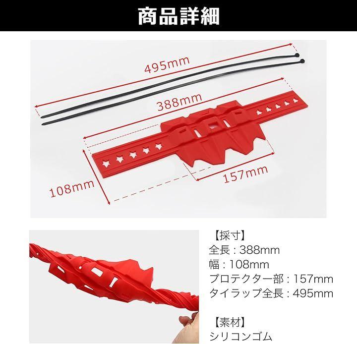 「サイズ」全長388mm、幅108mm、プロテクター部分の長さ157mm、結束バンドの全長495mmと、しっかりとしたサイズ設計で幅広いマフラーに適合します。
