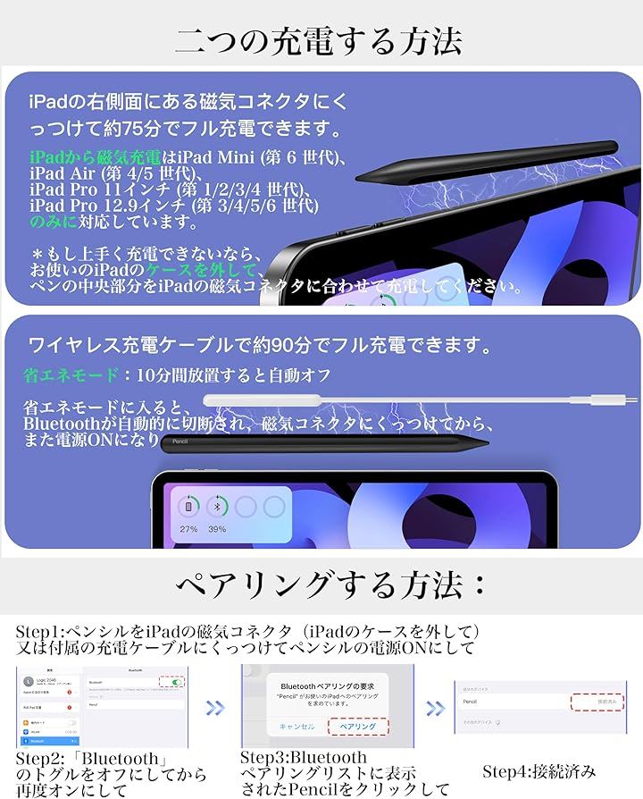 *「ペアリングと充電自動&書き心地がよい」iPadの右側面にある磁気コネクタにくっつけて自動的にペアリング完了と充電始め、手動でペアリングが必要ないです。