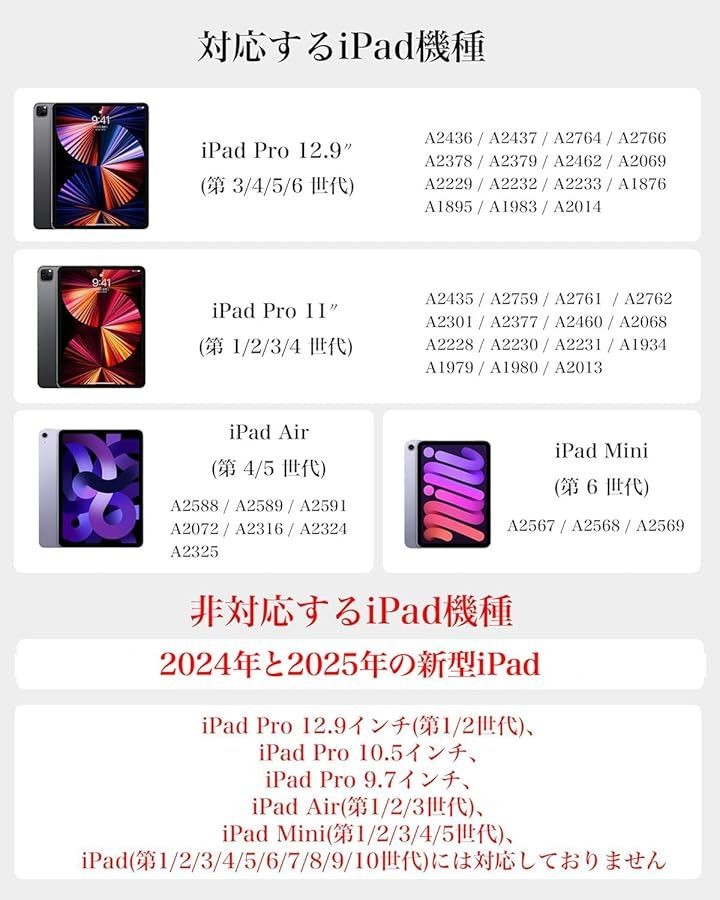 *「互換性」iPad Pro 12.9インチ(第3/4/5/6世代)、iPad Pro 11インチ(第1/2/3/4世代)、iPad Air(第4/5世代)、iPad Mini(第6世代) に対応しています。