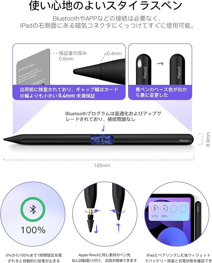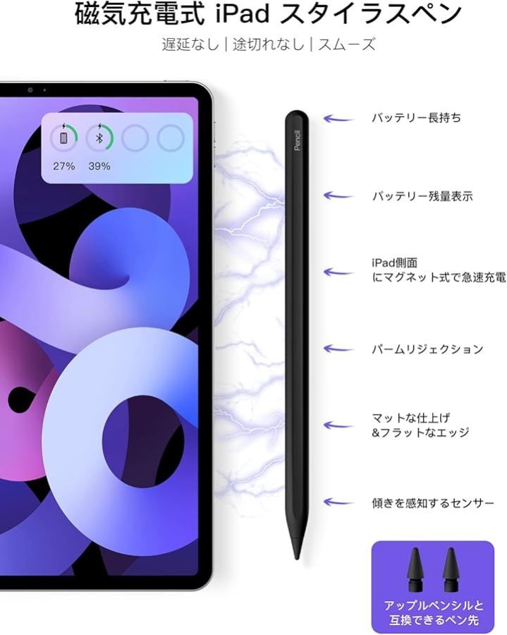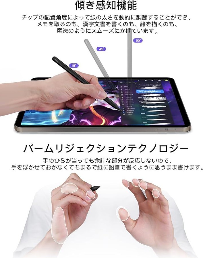 ペン先は純正Apple Pencilと互換性ある超耐摩耗性のペン先で、精度感度耐摩性が改良されて、ピクセルレベルの精密さと感じられないくらい微小なタイムラグを持ち、遅延も誤差もなくて、小さい文字でも書けて繊細な表現が可能です。