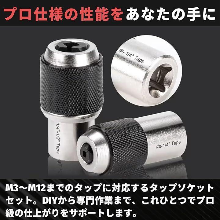 「幅広い適用性でプロも満足」 小型サイズ(M3~M6に対応)と大型サイズ(M8~M12に対応)の2種類がセットになったタップソケットセット。
