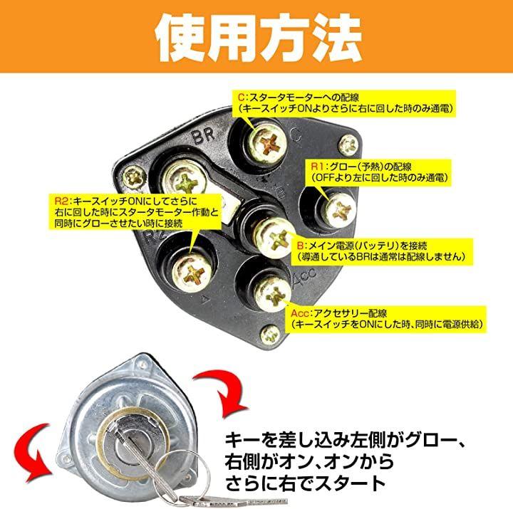 ・「ネジ部に配線するだけで使用可能」B:メイン電源(バッテリ)を接続(導通しているBrは通常は配線しません)、C:スタータモーターへの配線(キースイッチONよりさらに右に回した時のみ通電)、R1:グロー(予熱)の配線(OFFより左に回した時のみ通電)、R2:キースイッチONにしてさらに右に回した時にスタータモーター作動と同時にグローさせたい時に接続、Acc:アクセサリー配線(キースイッチをONにした時、同時に電源供給)