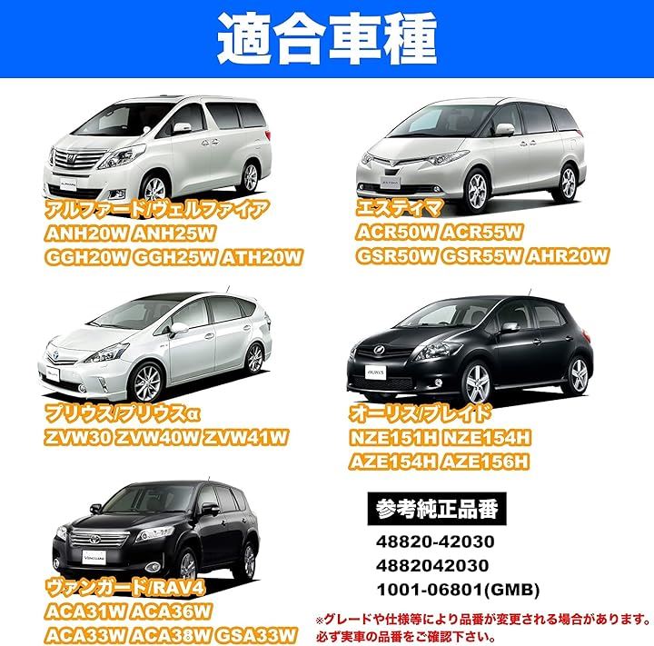 「参考適合車種」 ・アルファード ヴェルファイア ANH20W ANH25W GGH20W GGH25W ATH20W ・エスティマ ACR50W ACR55W GSR50W GSR55W AHR20W ・プリウス プリウスα ZVW30 ZVW40W ZVW41W ・RAV4 ヴァンガード ACA31W ACA36W ACA33W ACA38W GSA33W ・オーリス ブレイド NZE151H NZE154H AZE154H AZE156H
