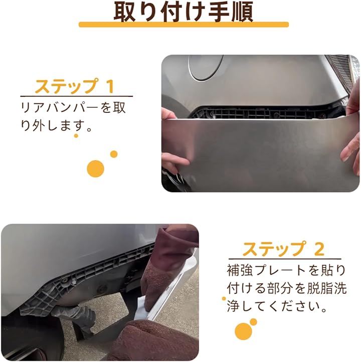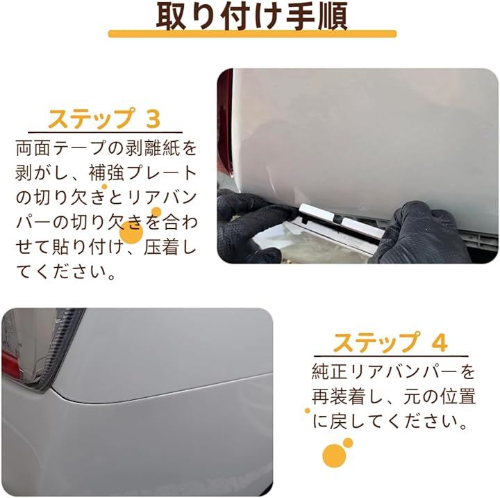 ・固定方式:両面テープ 取り付け方法 純正リアバンパーを取り外し、貼り付け部分を脱脂洗浄 両面テープの剥離紙を剥がし、補強プレートの切り欠きとバンパーの切り欠きを合わせて貼り付け 純正リアバンパーを再装着