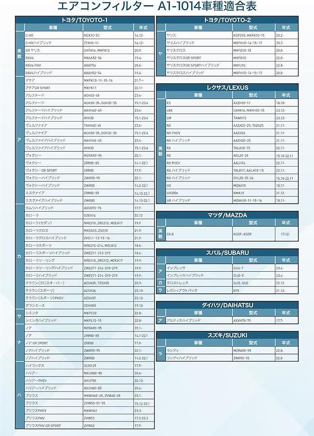 「セット内容」高性能カーエアコンフィルター 取扱説明書 「適合メーカー」トヨタ・レクサス・マツダ・スバル・ダイハツ・ホンダ・スズキ・三菱・日産に適合 *それぞれの適合車種についての詳細は画像をご確認ください。