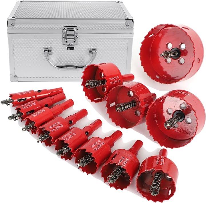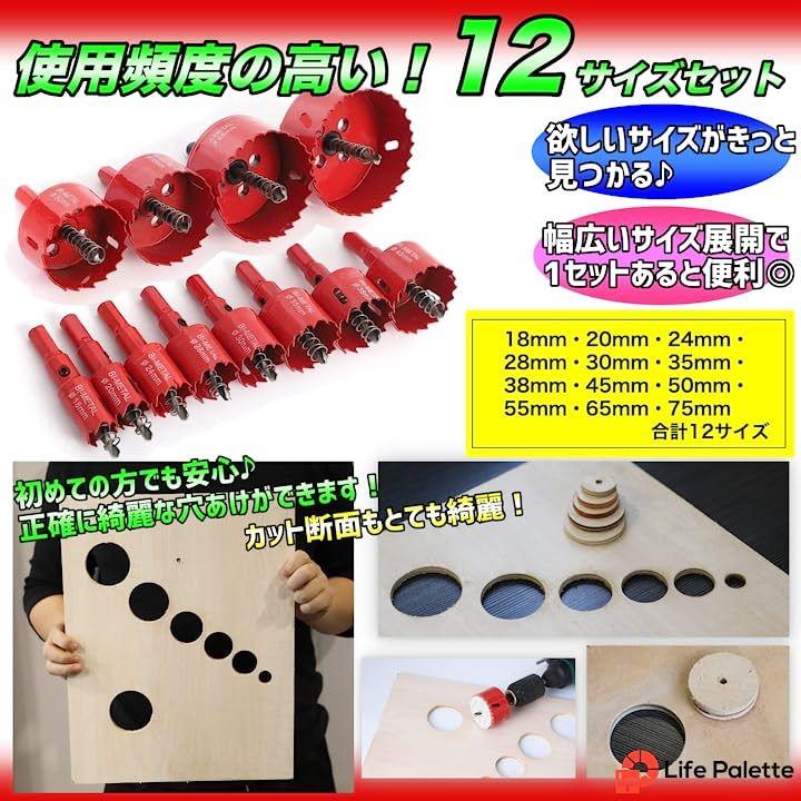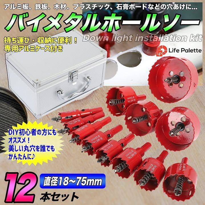 ・「使用頻度の高い12サイズを1セットに。持ち運びに便利なアルミケース付きセット」バイメタルホールソー 直径18~75mm 増量12本セット(18mm 20mm 24mm 28mm 30mm 35mm 38mm 45mm 50mm 55mm 65mm 75mm)。