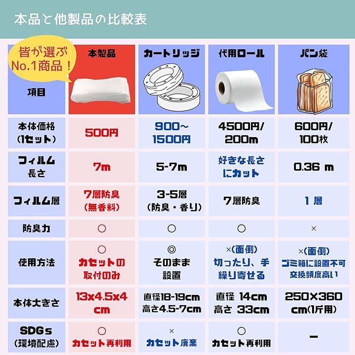 「特徴1」7層防臭により強力な防臭効果を発揮する,におわない袋です.純正品よりも価格が安く,経済的.折りたたみ済なので,詰め替えるだけ,取り替えるだけでOK