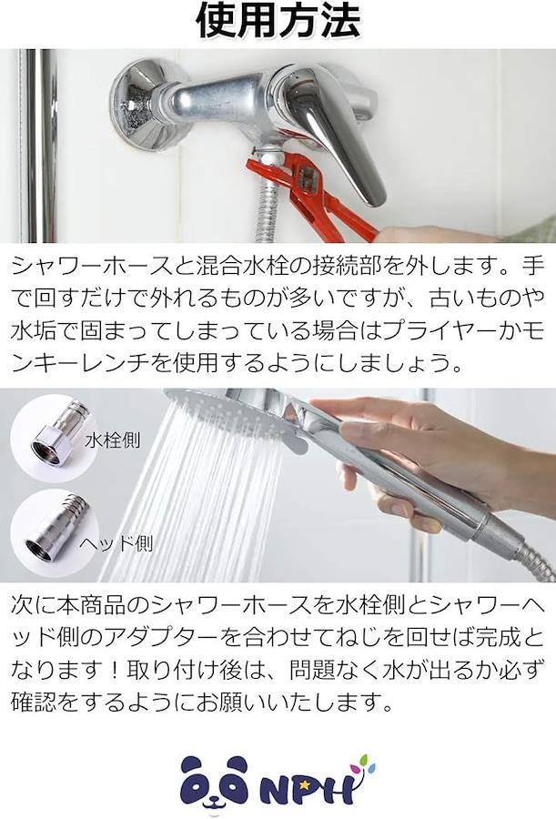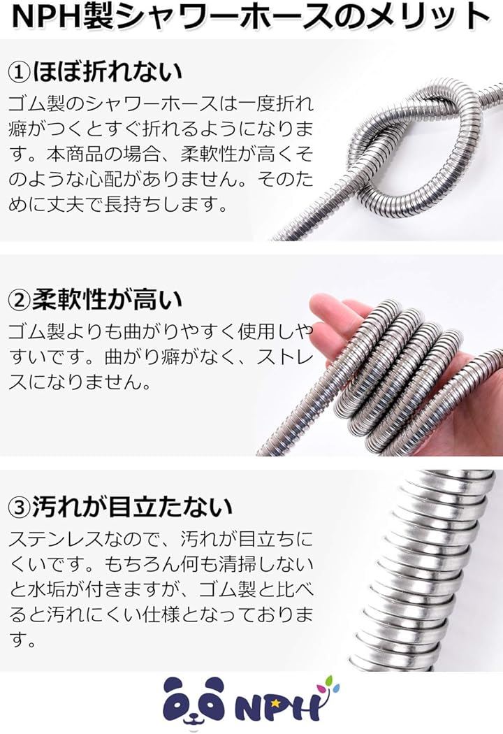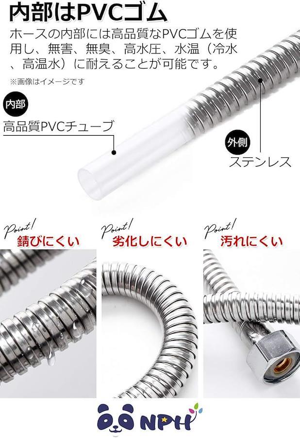 「NPH」製のシャワーホースは、サイズが合えば様々なタイプと交換可能です。内側は高品質なPVCゴムを使用し、無害、無臭、高水圧、水温(冷水、高温水)に耐えることが可能です。