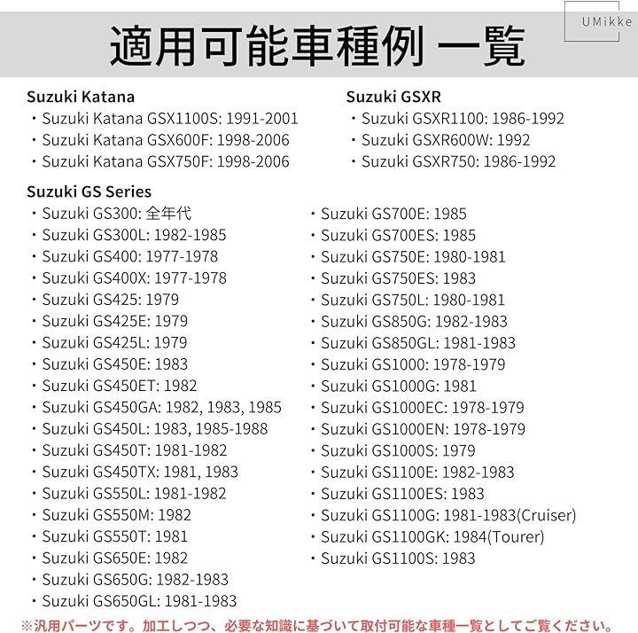 適用可能車種例:GSX1100S(1981-2001)、GSX750F(1998-2006)、GSXR750(1986-1992)、GS300、GS450、GS550、GS650、GS750、GS850、GS1000、GS1100、他、商品画像をご確認ください。