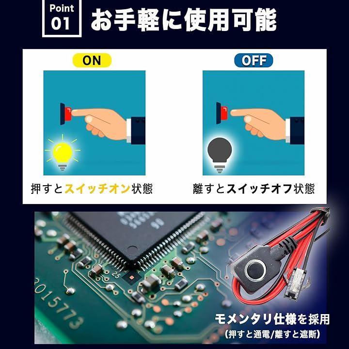 モメンタリ仕様を採用しているので、押すとスイッチオン(通電)/離すとスイッチオフ(遮断)の簡単動作。