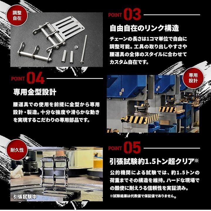 「このためだけに生まれた、専用金型設計」 自転車チェーンや他用途の金具などの流用ではなく、腰道具での使用を前提に金型から専用に設計・製造。
