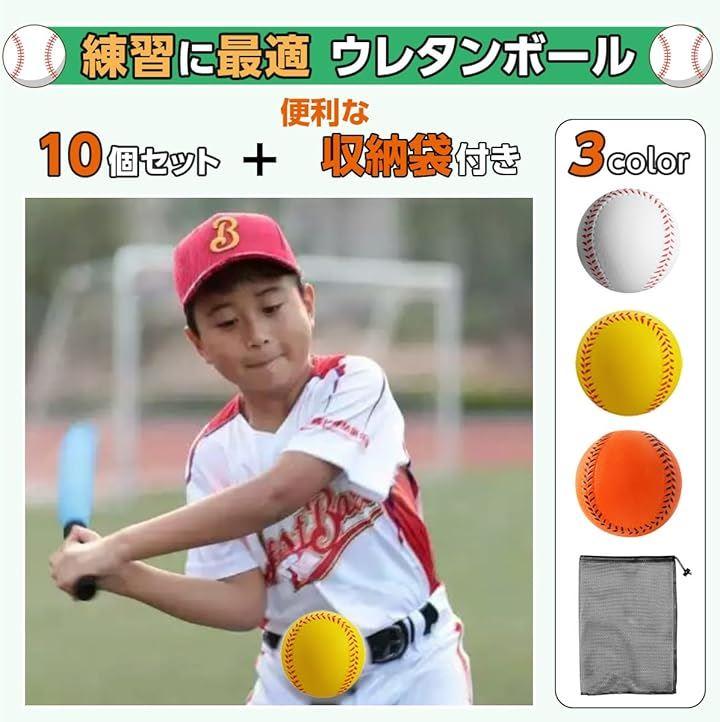 「仕様」直径:約7cm、重さ:28g、材質:ウレタン「セット内容」ウレタン製野球ボール10個セット+収納袋つき「カラーバリエーション」白/黄色/オレンジ