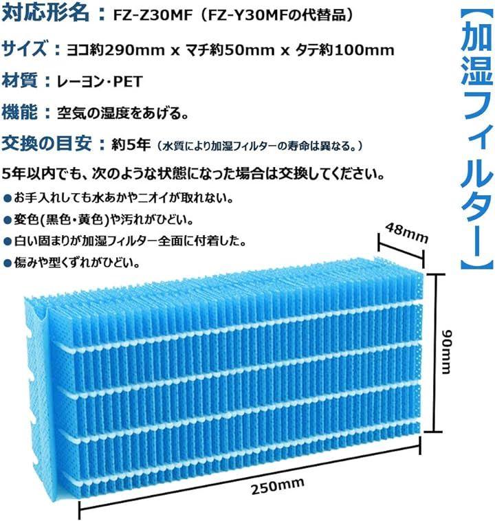 「加湿フィルターの商品詳細」対応形名:FZ-Z30MF(FZ-Y30MFの代替品)サイズ:ヨコ約290mm x マチ約50mm x タテ約100mm材質:レーヨン・PET機能:空気の湿度をあげる。