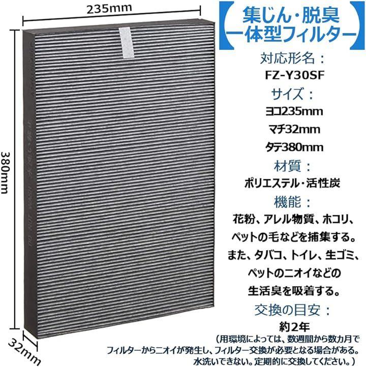 「対応機種」KC-30K1-WKC-30K2-B KC-30K2-WKC-30T1-WKC-30T2-WKC-30T3-B KC-30T3-WKC-30T4-B KC-30T4-WKC-Y30-P KC-Y30-W「集じん・脱臭一体型フィルターの商品詳細」対応形名:FZ-Y30SFサイズ:ヨコ240mm x マチ32mm x タテ380mm材質:ポリエステル・ポリプロピレン・活性炭「集じん・脱臭一体型フィルターのメンテナンス目安」お手入れ目安時期:3ヶ月に1回(お手入れしていただくことで、フィルターが長持ちする。