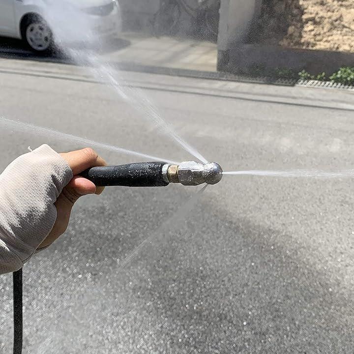 先端のノズル前方1箇所、後方3箇所から高圧水が逆噴射し、配管に沿って進み詰まりを解消します。