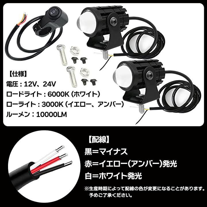 ・「仕様」 電圧 : 12V、24V / ロードライト : 6000K (ホワイト) / ローライト : 3000K (イエロー、アンバー) / ルーメン:10000LM / 配線 : 黒=マイナス、赤=イエロー(アンバー)発光、白=ホワイト発光 *生産時期によって廃線の色が変更になることがありますので予めご了承ください。