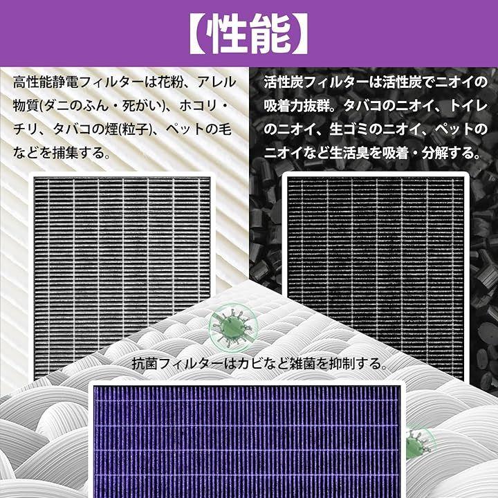 「性能」高性能静電フィルターは花粉、アレル物質(ダニのふん・死がい)、ホコリ・チリ、タバコの煙(粒子)、ペットの毛などを捕集する。
