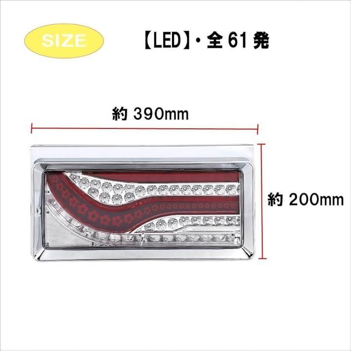 「商品内容」・本体x2個 左右セット 取り付けブラケット付き(ボルトは付属しません)「サイズ」・縦:約200mm・横:約390mm「電圧」・24V用「LED」♦ ウインカー:15LED (オレンジ) ♦ スモールランプ:ライトバー+12LED (レッド) ♦ ストップ:スモール+27LED (レッド) ♦ バック:7LED 「ボディカラー」・クリアレンズ/レッドバー(裏面はブラックです)「配線」・白線:バック用・黄線:ウインカー用・赤線:赤光/強い光/ブレーキ・青線:赤光/弱光/走行・黒線:マイナス「参考適合車種」・汎用タイプなのでふそう、日野、UD、いすゞ 等様々な車種にご使用が可能で御座います。