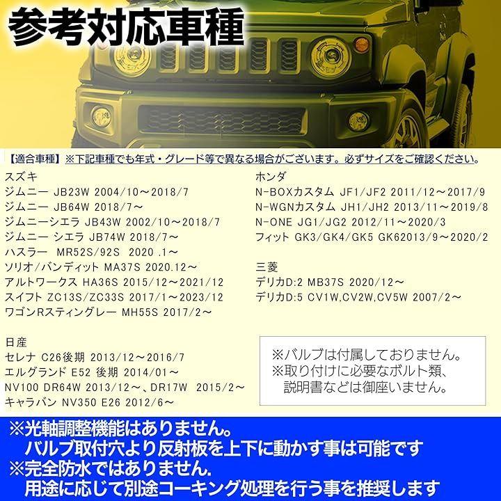 参考適合車種 スズキ ジムニー JB23W 2004/10~2018/7 ジムニー JB64W 2018/7~ ジムニーシエラ JB43W 2002/10~2018/7 ジムニー シエラ JB74W 2018/7~ ハスラー MR52S/92S 2020 .1~ ソリオ/バンディット MA37S 2020.12~ アルトワークス HA36S 2015/12~2021/12 スイフト ZC13S/ZC33S 2017/1~2023/12 ワゴンRスティングレー MH55S 2017/2~ 日産 セレナ C26後期 2013/12~2016/7 エルグランド E52 後期 2014/01~ NV100 DR64W 2013/12~、DR17W 2015/2~ キャラバン NV350 E26 2012/6~ ホンダ N-BOXカスタム JF1/JF2 2011/12~2017/9 N-WGNカスタム JH1/JH2 2013/11~2019/8 N-ONE JG1/JG2 2012/11~2020/3 フィット GK3/GK4/GK5 GK62013/9~2020/2 三菱 デリカD:2 MB37S 2020/12~ デリカD:5 CV1W,CV2W,CV5W 2007/2~