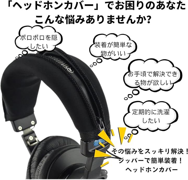 「ヘッドホンカバー」でお困りのあなた こんな悩みありませんか? ボロボロを隠したい…装着が簡単な物がいい… お手頃で解決できる物が欲しい…定期的に洗濯したい… その悩みをスッキリ解決。 ジッパーで簡単装着.ヘッドホンカバー。