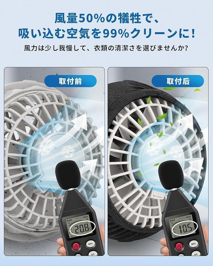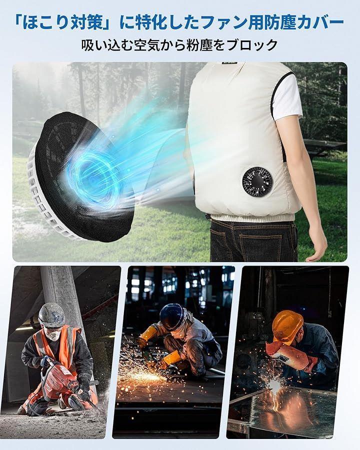 「防塵カバー」空調作業服用防塵フィルターは、異物などを予防するのに有効,ファンにカバーを取り付けることで 粉塵、糸くず、小枝、葉などの服の内部への侵入を防ぎ、 ファンそのものも保護してくれるので、 分解して掃除することができないタイプのファンでも安心。