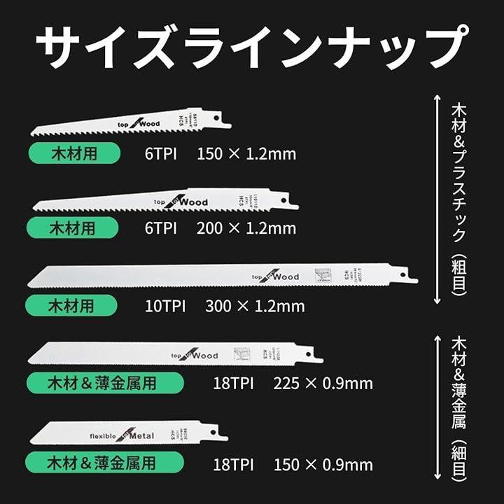 また、木材と薄金属の切断には18TPIの細かい歯を備えたブレードをご使用いただけます。