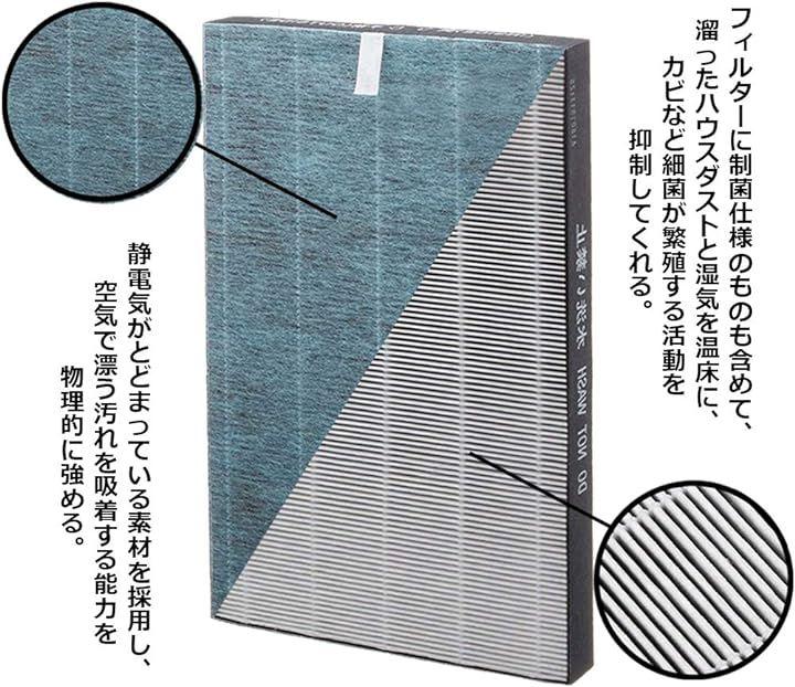 帯電性付き不織布の材料から作られたフィルターは抗菌機能を付き、微小な粒子のホコリや花粉を吸着する。