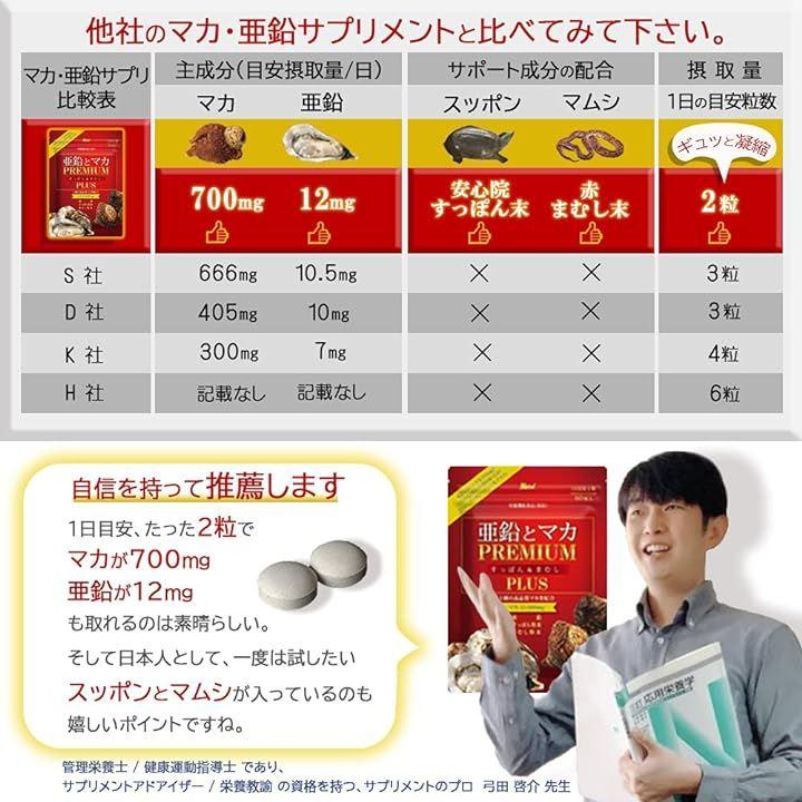 マカ末(ペルー製造、国内製造)、還元麦芽糖水飴、黒マカエキス末、スッポン末、マムシ末/グルコン酸亜鉛、結晶セルロース、ステアリン酸カルシウム、HPC,微粒二酸化ケイ素