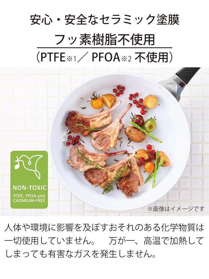 【セラミック加工】セラミックスは熱まわりが良く、フライパン内側全体からの遠赤外線効果で、中火でもしっかり火が通り、食材の芯まで熱が届く。肉料理をジューシーに、野菜炒めをシャキッと仕上げる。また、人体や環境に影響を及ぼす可能性のある化学物質 (PTFE ※1やPFOA ※2) は使用していない。※1 PTFE : ポリテトラフルオロエチレン=フッ素樹脂成分、※2 PFOA : ペルフルオロオクタン酸=フッ素樹脂製造過程で使われる化学物質