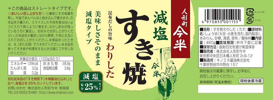 他社製品に比べて塩分量の少ない人形町今半で初の減塩タイプのすき焼割下。「美味しい なのに 減塩」をコンセプトとし、「減塩=味が落ちる」というイメージを払しょくする商品に仕上げました。原料に減塩醤油を使用し、昆布だしによる旨味を高めたことで、美味しさを損なうことなく、当社比でさらに25%の減塩に成功致しました。健康意識の高い方・高血圧リスクを抱える方・すき焼にあっさりとした味を嗜好するお客様などにおすすめです。