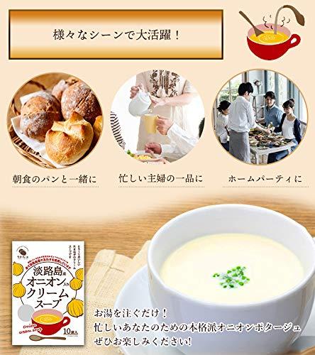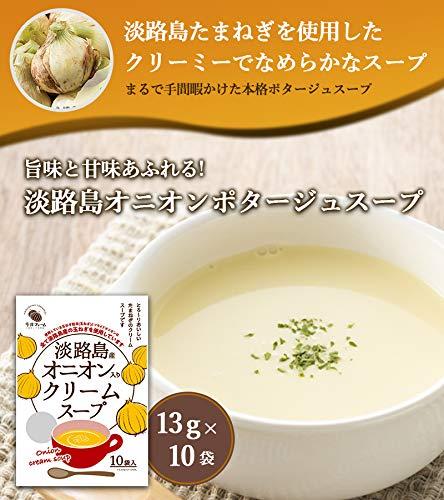 うまみと甘みあふれる。淡路島産たまねぎを使用したクリーミーでなめらかなスープ。1袋でマグカップ10杯分商品詳細:素材の旨味をたっぷりと引き出した濃厚なポタージュ。原材料名:玉ねぎ粉末(玉ねぎ、デキストリン)(国内製造)、粉末油脂(乳脂肪、食用植物油脂、コーンシロップ、粉末水あめ、マルトース、乳たん白、食用精製加工油脂)、ぶどう糖、でん粉、砂糖、食塩、チーズ粉末、たん白加水分解物加工品、酵母エキス、粉末醤油、発酵調味料、香辛料、うきみ・具(フライドオニオン、乾燥パセリ)/調味料(アミノ酸等)、増粘剤(キサンタン)、乳化剤、酸化防止剤(V.E)、(一部に小麦・乳成分・大豆・ゼラチンを含む)内容量:一袋13g×10本賞味期限:製造日より1年間保存方法:直射日光を避け常温で保存して下さい。原産地:淡路島調理方法:1袋を開けお湯を150gそそぐと完成!【重要】メーカーによる商品リニューアルに伴いパッケージ(内容量も含む)変更が行われた場合、新パッケージでお届け致します事ご了承願います。