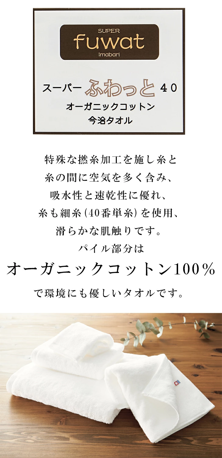 特殊な撚糸加工を施し糸と糸の間に空気を多く含み、吸水性と速乾性に優れ、糸も細糸(40番単糸)を使用、滑らかな肌触りです。パイル部分はオーガニックコットン100%で環境にも優しいタオルです。