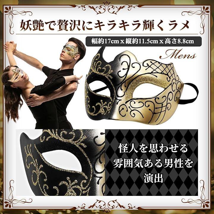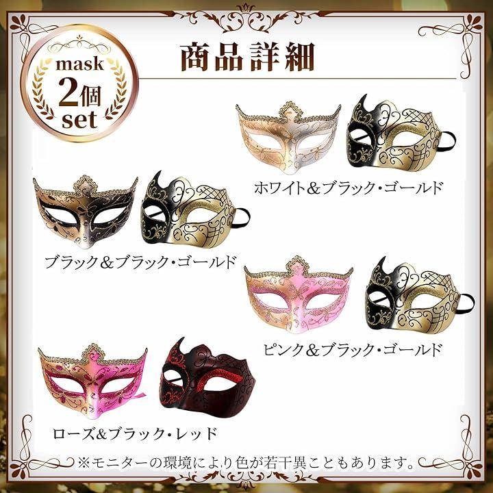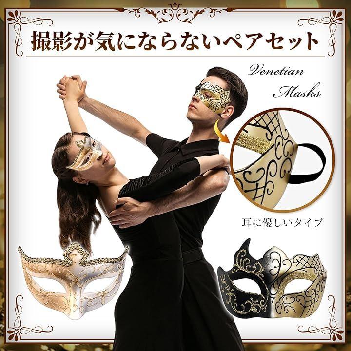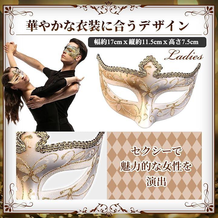 セット内容:ホワイトに金ラメを施した、レディース向けデザインの仮面(幅17cm 縦11.5cm 高さ7.5cm)と、ブラック&ゴールドに金のラメを施した、ベネチアンマスク メンズ向けデザインのマスク(幅17cm 縦11.5cm 高さ 8.8cm)の2個セット。