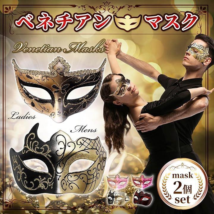 仮面 ベネチアンマスク:贅沢に施されたキラキラ輝くラメが妖艶な、男性向けのデザインと女性向けデザインのマスカレードマスク(masquerade mask)のセット。